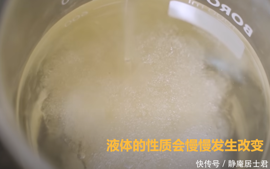 此时,如果你将这种液体倒入含有水的烧杯当中,它就会凝结为块状的柔软固体。