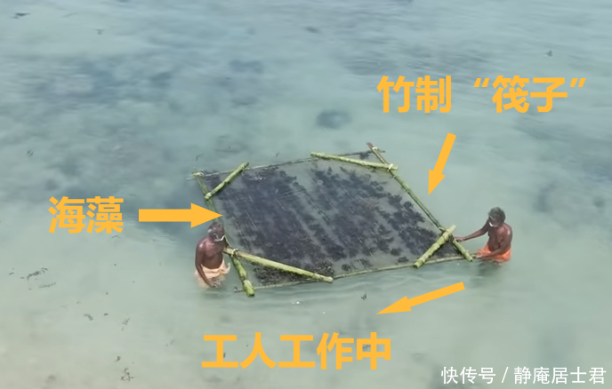 他们会将一根又一根的海藻幼苗捆绑在专门编制成的“竹筏”上,将其丢进海中,等待自然生长。