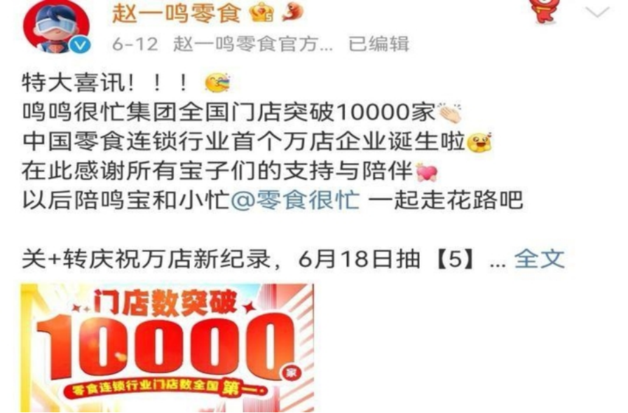 2024年6月30日,零食行业的一个现象:赵一鸣零食品牌通过官方微博宣布,其第10000家门店正式开业,成为众多零食品牌中首个实现万店目标的企业。