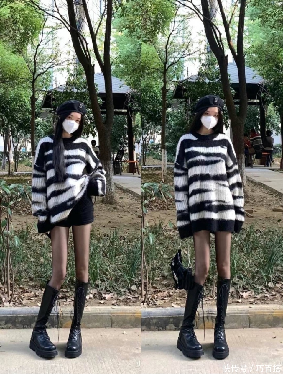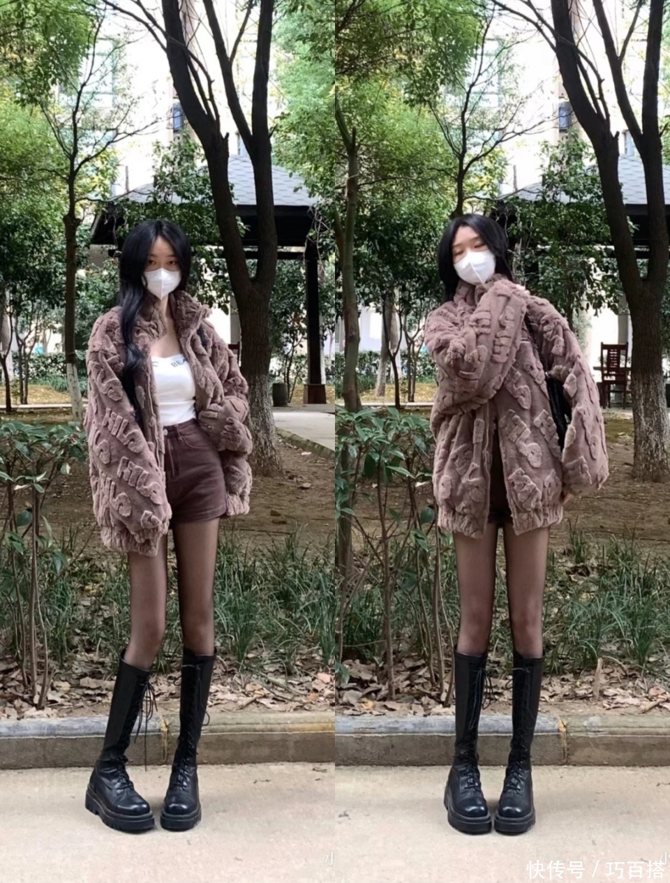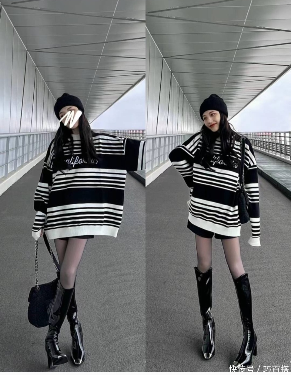 前种上镜效果更好看,但现实中容易给人一种弱不禁风的感觉,尤其是在加厚大衣的衬托下,黑丝和长靴看上去会非常没有支撑力。