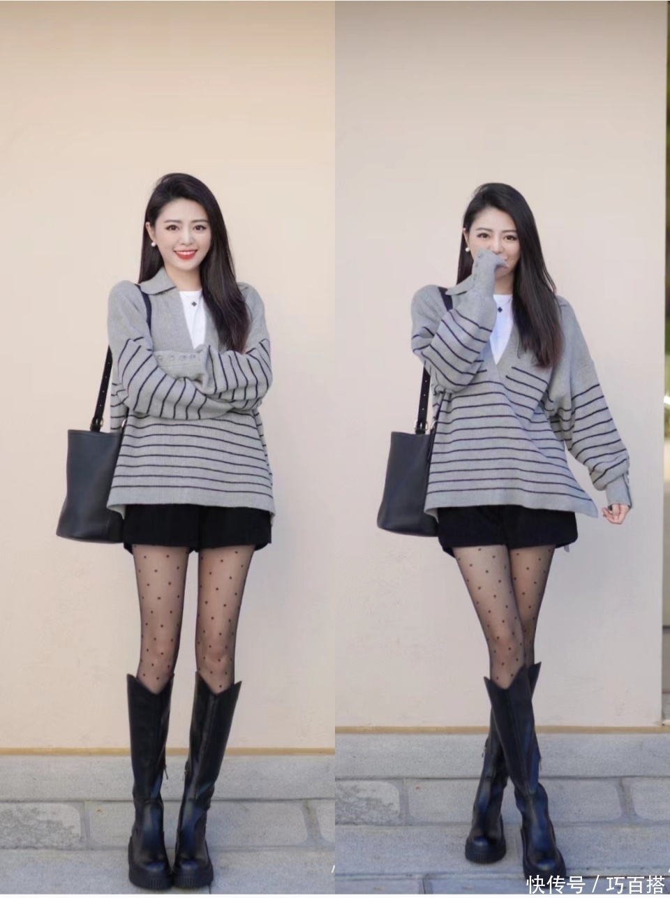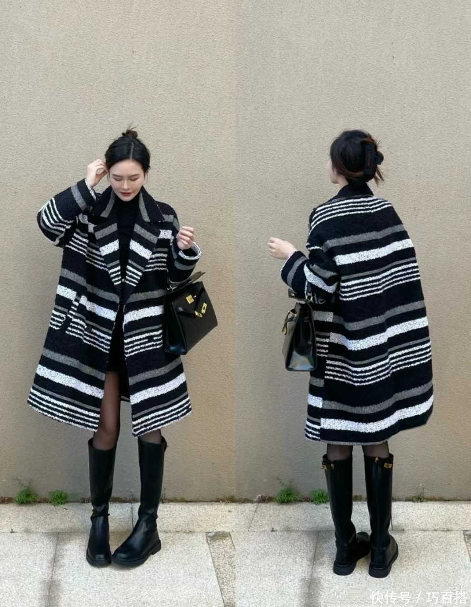腿型不好看的姐妹像博主一样搭配廓形外套也无伤大雅,若隐若现的露出黑丝的存在,遮肉显瘦又很神秘,女人味十足,吸引力一绝,不管大衣长度是否和高筒靴堆叠,都不影响观感,安全感满满。