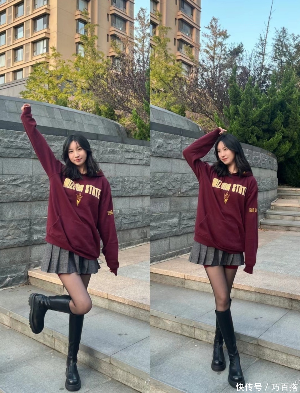 第二种模式可以借鉴博主身上这套造型,常规长度卫衣搭配百褶短裙,时髦洋气又有辨识度,日常外穿出门一点不浮夸,如果你是学生党,完全可以照搬照抄。