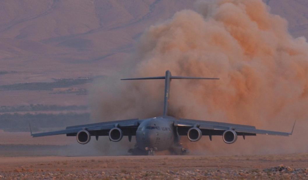 【C17运输机在土跑道起降】