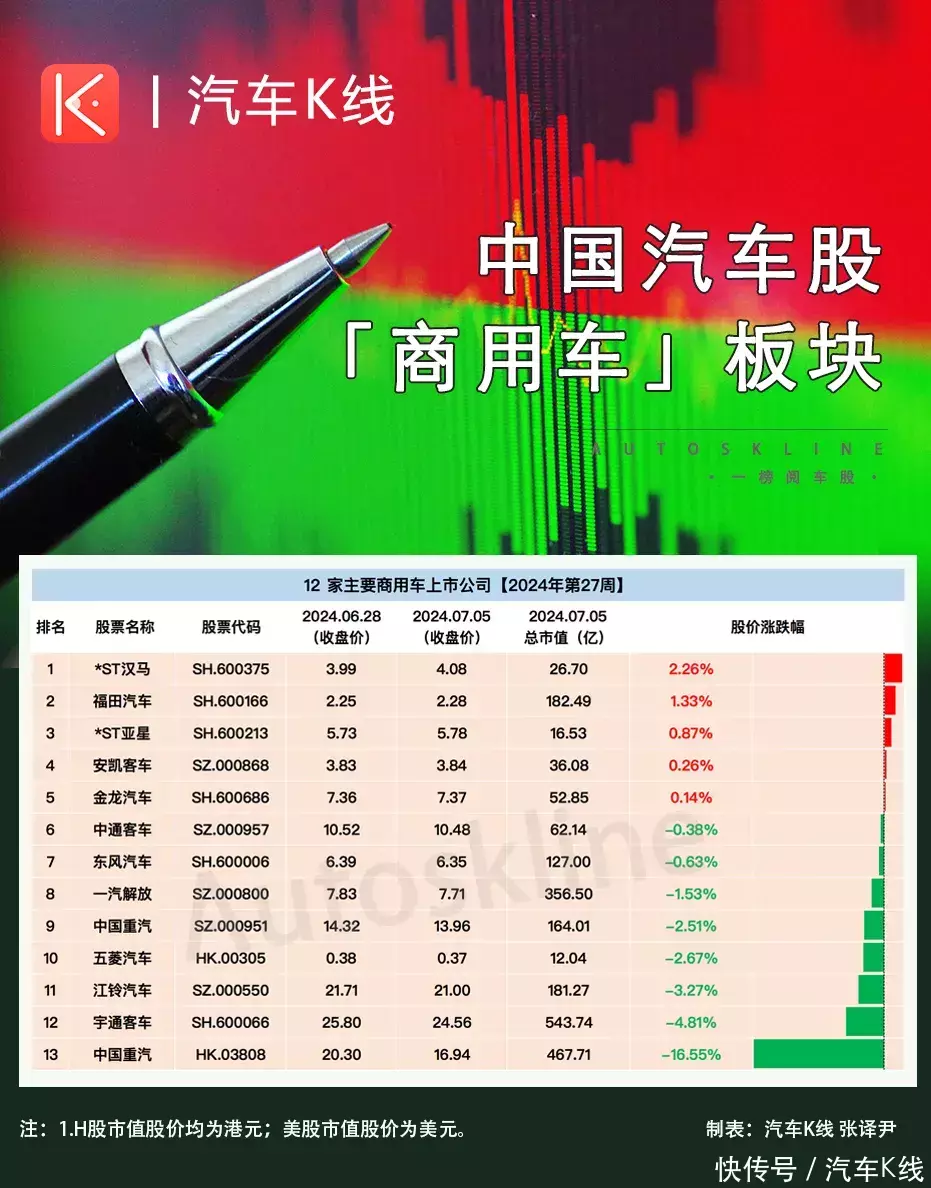第27周,商用车板块以跌为主,一周跌幅为2.11%。其中,上涨个股5只,下跌个股8只。
