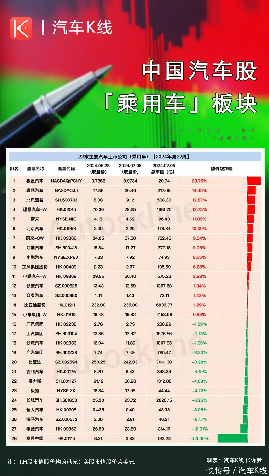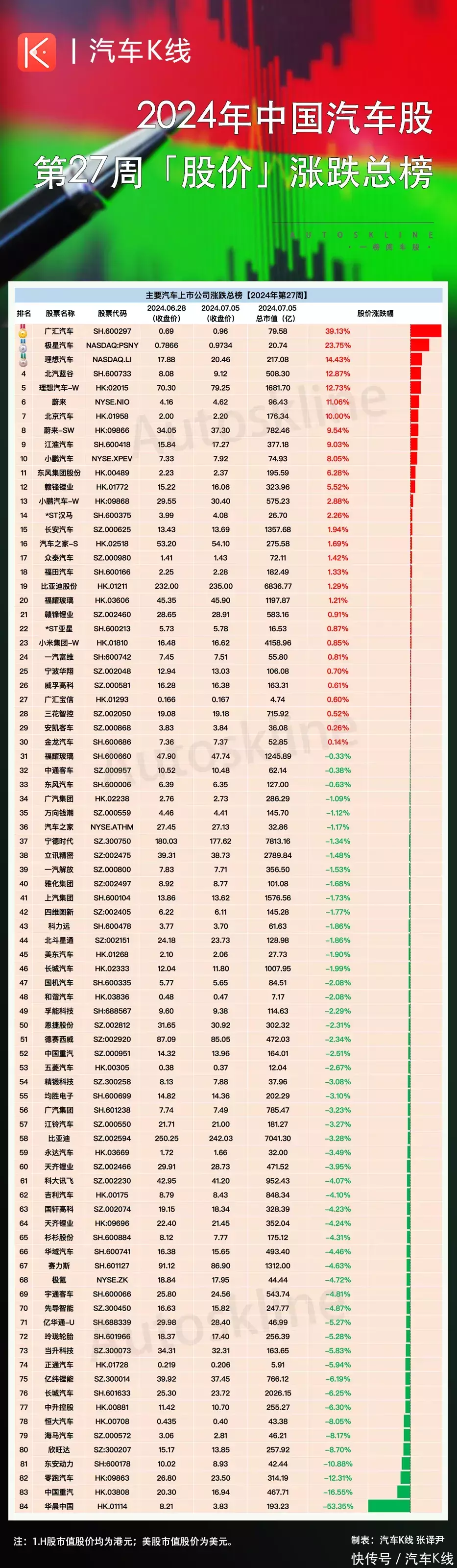 第27周,汽车股惨遭五周连跌,而7月和2024下半年也以出师不利开局。那么,经历了一个多月下行行情的汽车股,能否在下周迎来转机,实现止跌回升呢?我们下期见!后附:《2024年第27周股价涨跌总榜》