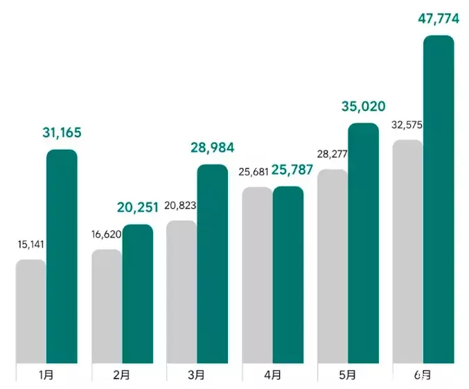 理想汽车披露交付数据显示,6月交付新车4.78万辆,同比增长46.7%;1~6月累计交付18.9万辆,同比增长35.84%。