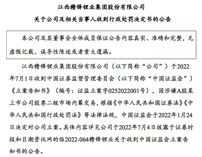 此外,赣锋锂业收到江西证监局下发的《行政处罚决定书》。公司涉嫌内幕交易“*ST江特”股票,中国证监会江西监管局决定没收公司违法所得110.53万元,并处以331.59万元罚款;对董事长李良彬给予警告,并处以60万元罚款;对时任董事会秘书欧阳明给予警告,并处以20万元罚款。