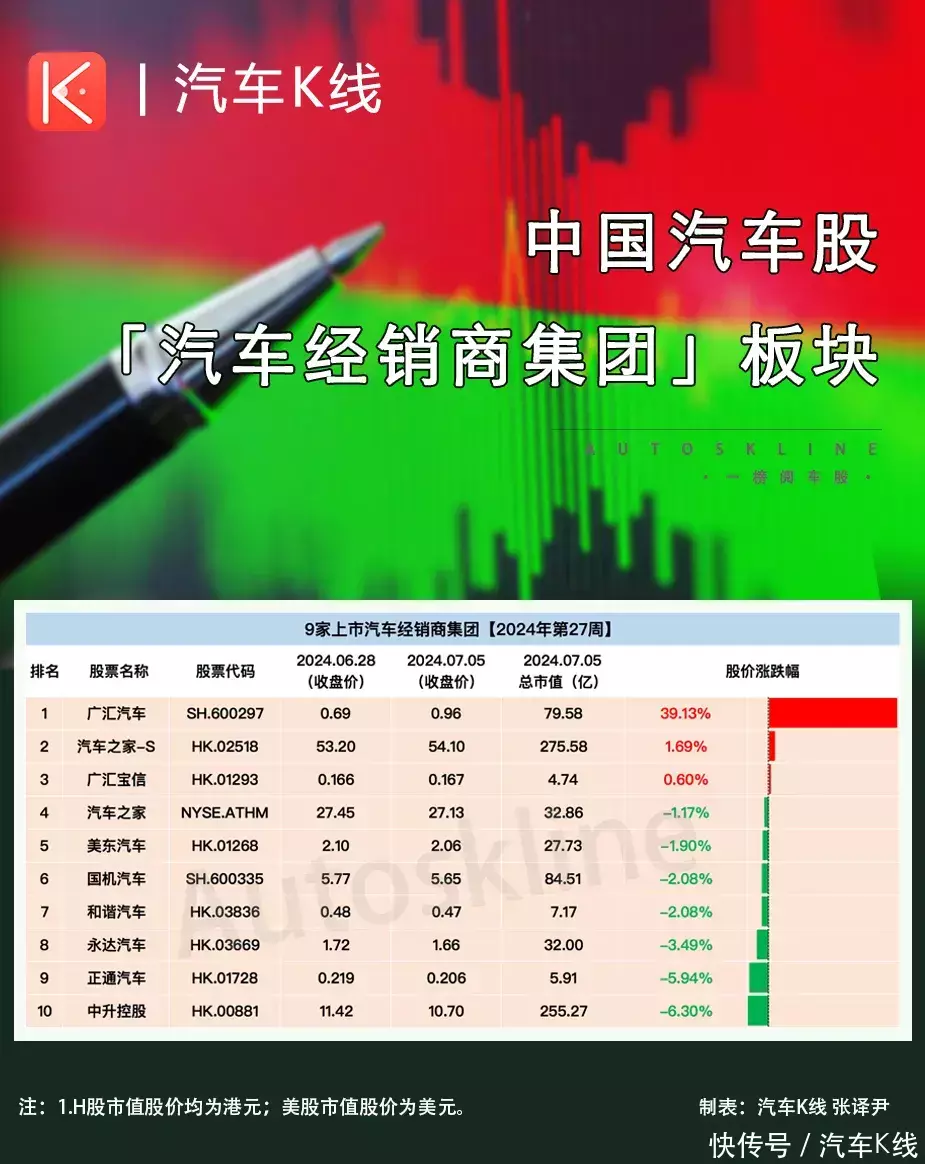 第27周,经销商板块“绿多红少”。不过,在广汇汽车的加持下,板块平均周股价整体实现1.85%的上涨。其中,上涨的个股仅3只,下跌个股7只。