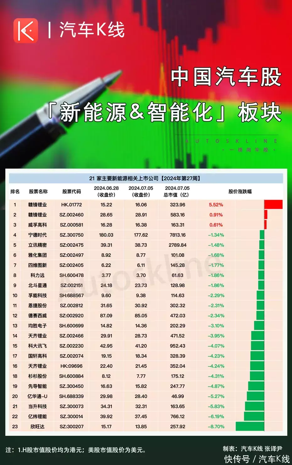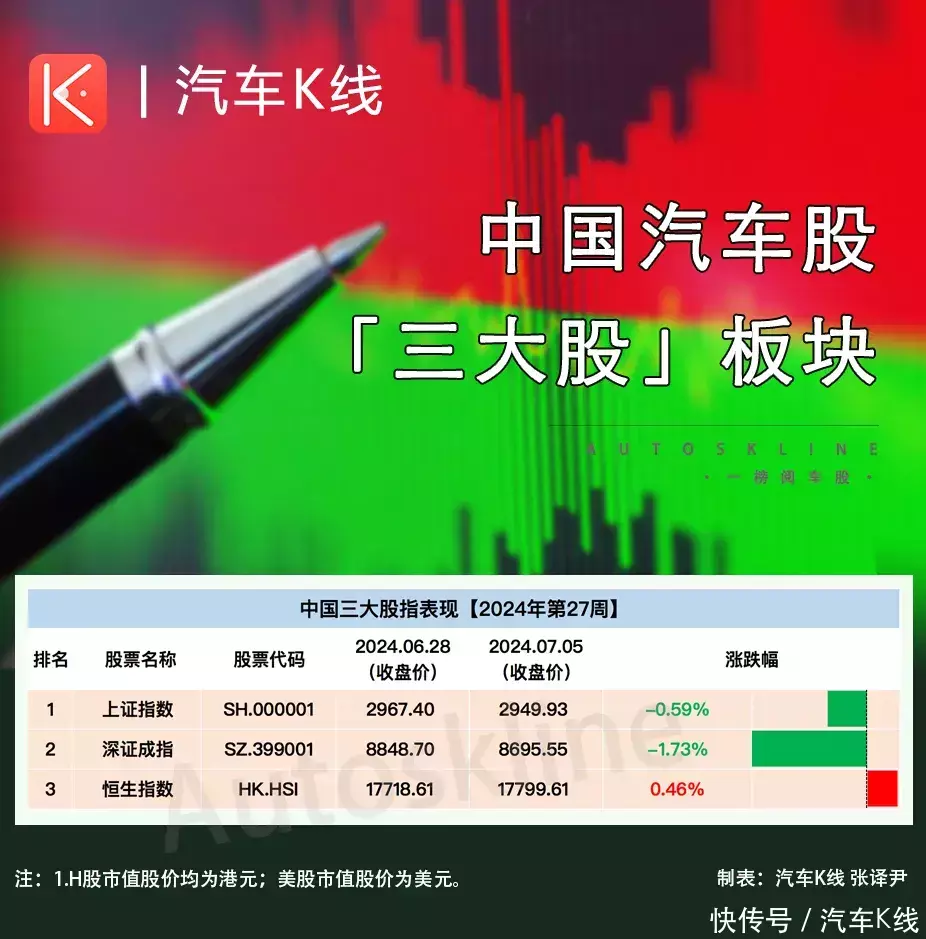 第27周,中国汽车股继续走低,出现五周连跌。《汽车K线》统计在册的84只汽车股平均股价跌幅,由前一周的下跌2.87%收缩至0.98%,总市值则下探至5.86万亿元。