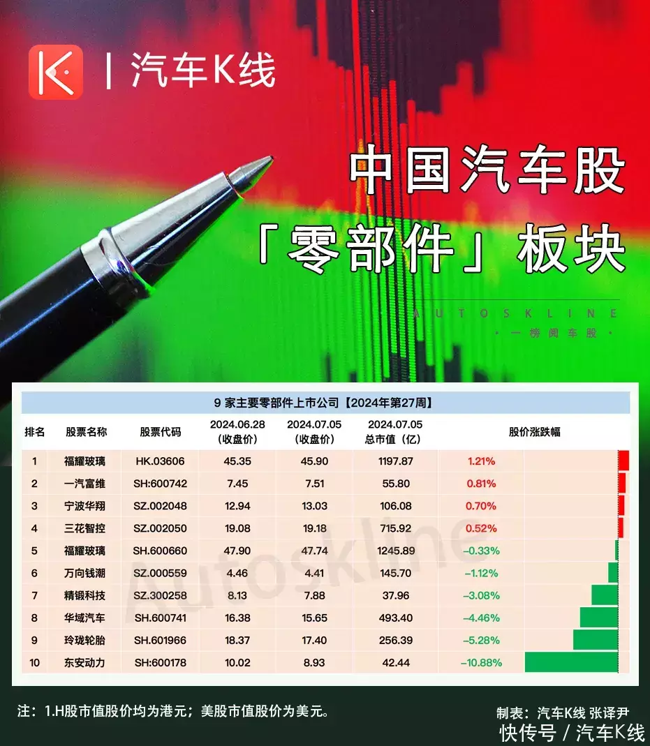 第27周,零部件板块同样以跌为主,一周跌幅为2.19%。其中,上涨个股4只,余下6只个股均出现下跌。